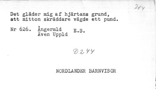 //// Det gläder mig af hjärtans grund, //// att nitton skräddare vägde ett pund. //// Nr 626. Angermld E.S. //// Även Uppld //// h //// i //// NORDLANDER BARNVISOR //// H //// H //// [ //// g ////