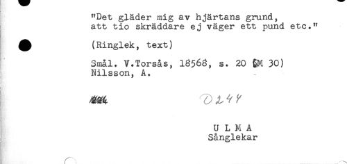 //// "Det gläder mig av hjärtans grund, //// att tio skräddare ej väger ett pund etc." //// ^ (Ringlek, text) //// Smål. V.Torsås, 16566, s. 20 §M 30) //// Nilsson, A. //// W' //// } //// U L M A //// Sånglekar ////