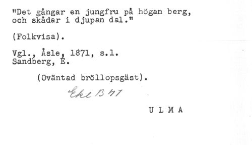 //// "Det gångar en jungfru på högan berg, //// och skådar i djupan dal." //// (Folkvisa). //// Vgl., Åsle, 1371, s.l. //// Sandberg, E. //// (Oväntad bröllopsgäst). //// U L M A ////