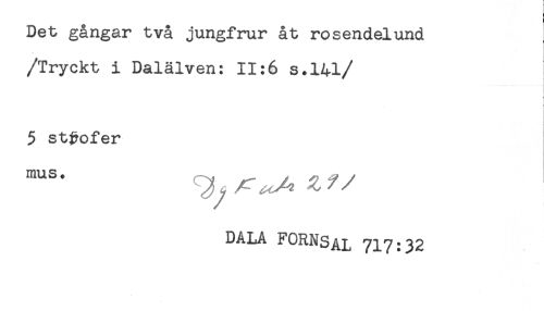 //// Det gångar två jungfrur åt rosendelund //// /Tryckt i Dalälven: 11:6 s.141 //// /< //// i //// 5 strofer //// /r A t/y //// DALA FORNSAL 717:32 ////