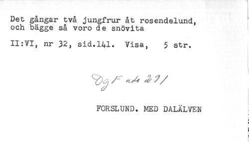 //// Det gångar två jungfrur åt rosendelund, //// och bägge så voro de snövita //// II:VI, nr 32, sid.141. Visa, 5 str. //// FORSLUND. MED DALÄLVEN //// H //// H //// B //// 5 ////