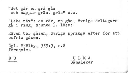 //// "det går en grå gås //// och nappar grönt gräs" etc. //// "Leka räv": en räv, en gås, övriga deltagare //// gå i ring, sjunga 1. läsa: //// Räven tar gåsen, övriga springa efter för att //// befria gås§n. //// Ögl. Mjölby, 359:3, s.3 //// Törnqvist //// * //// D 3 U L M A //// ^ Sånglekar ////