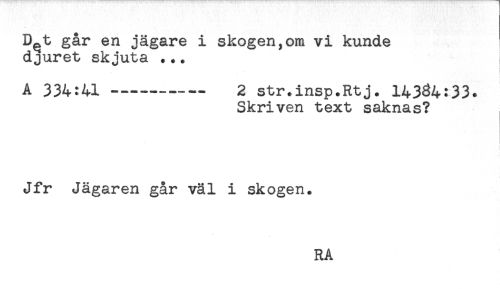 //// D^t går en jägare i skogen,om vi kunde //// djuret skjuta ... //// A 334:41 —---- 2 str.insp.Rtj. 14334:33. //// Skriven text saknas? //// Jfr Jägaren går väl i skogen. //// RA ////