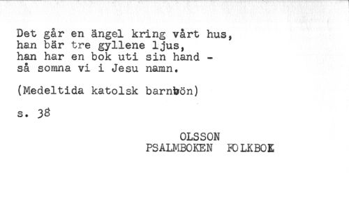 //// Det går en ängel kring vårt hus, //// han bär tre gyllene ljus, //// han har en bok uti sin hand - //// så somna vi i Jesu namn. //// (Medeltida katolsk barnbön) //// s. 33 //// OLSSON //// PSALMBOKEN BO LKBOB ////