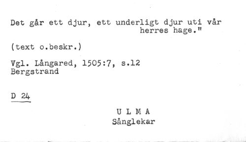 //// Det går ett djur, ett underligt djur uti vår //// herres hage." //// (text o.beskr.) //// Vgl. Långared, 1505:7, s.12 //// Bergstrand //// D 24 //// U L M A //// Sånglekar //// -jf*. ////