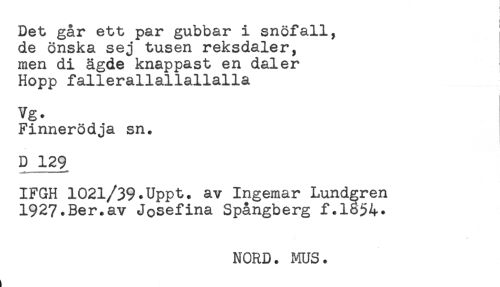 //// Det går ett par gubbar i snöfall, //// de önska sej tusen reksdaler, //// men di ägde knappast en daler //// Hopp fallerallallallalla //// Vg. //// Finnerödja sn. //// D 129 //// IFGH 1021/39.Uppt. av Ingemar Lundgren //// 1927.Ber.av Josefina Spångberg f.1854. //// NORD. MUS. ////