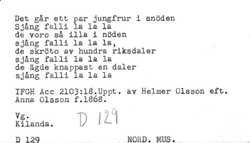 //// Det går ett par jungfrur i snöden //// Sjång falli la la la //// de voro så illa i nöden //// sjång falli la la la, //// de skröto av hundra riksdaler //// sjång falli la la la //// de ägde knappast en daler //// sjång falli la la la //// IFGH Acc 2103:13.Uppt. av Helmer Olsson eft. //// Anna Olsson f.1363. //// *! //// Vg. //// Kilanda. . — //// D 129 NORD. MUS. ////
