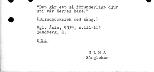 //// "Det går ett så förunderligt djur //// uti vår Herres hage." //// ^ {Blindbockslek med sång.) //// Vgl. Åsle, 9339, s.114-115 //// Sandberg, E. //// D24_ //// < //// K'. //// U L M A //// Sånglekar ////