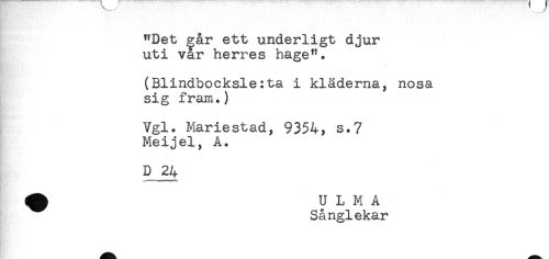 //// .. //// - //// "Det crår ett underligt djur //// uti var herres hage". //// - //// (Blindbocksle:ta i kläderna, nosa //// sig fram.) //// Vgl. Mariestad, 9354, s.7 //// Meijel, A. //// D 24 //// ^ U L M A //// Sånglekar ////