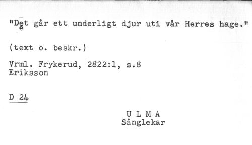 //// "Det går ett underligt djur uti vår Herres hage." //// (text o. beskr.) //// Vrml. Frykerud, 2322:1, s.3 //// Eriksson //// D 24 //// U L M A //// Sånglekar ////