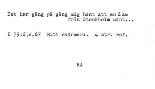 //// Det har gång på gång mig hänt att en d am //// från Stockholm sänt... //// B 79:2,s.67 Mitt svärmeri. 4 str. ref. //// RA //// T ////