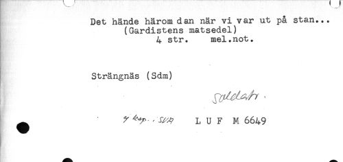 //// Det hände härom dan när vi var ut på stan... //// (Gardistens matsedel) //// 4 str. mel.not. //// \ //// Strängnäs (Sdm) //// LUF M 6649 ////