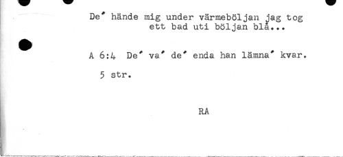 //// De* hände mig under värmeböljan jag tog //// ett bad uti böljan blå... //// A 6:4 De* va* de* enda han lämna* kvar. //// 5 str. //// I RA ////