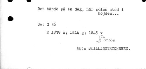 //// Det hände på en dag, när solen stod i //// höjden... //// Se: G 36 //// E 1839 z; 1344 g; 1345 v //// J J f ^ //// KB:s SKILLINGTRYCKSREG. //// ! //// ! ////