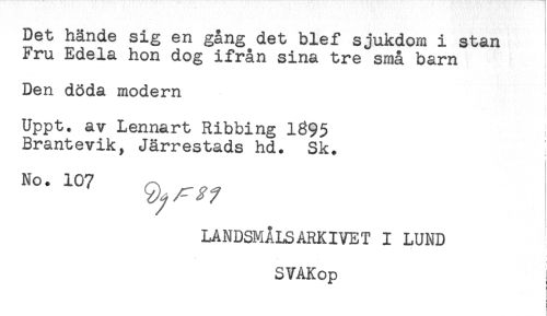 //// Det hände sig en gång det blef sjukdom i stan //// Fru Edela hon dog ifrån sina tre små barn //// ) //// Den döda modern //// Uppt. av Lennart Ribbing 1395 //// Brantevik, Järrestads hd. Sk. //// No. 107 r^ //// LANDSMÅLSARKIVET I LUND //// SVAKop ////