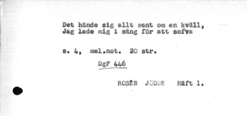 //// Dat hände nig aJULt sent ow en kväll, //// Jag lade sig i säng för att sofva //// s. 4, mal.not. 20 str. //// DgF 446 //// ROSÉN JÖDbF H*ft 1. ////