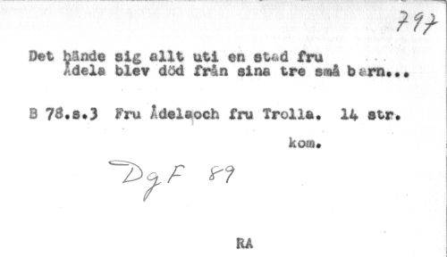 //// Det hände sig allt uti en at^d fru //// Adela blev död från aina tre små b i rn... //// 8 73.s.3 Fru Adeleech fru Trolla. 14 str. //// . //// kom. //// .... V //// RA //// ! ////