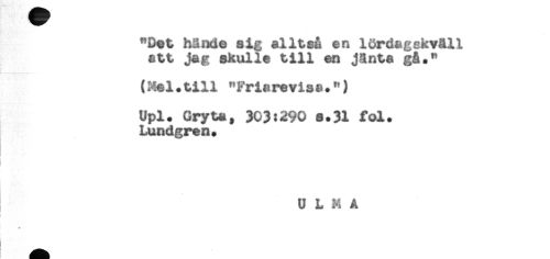 //// "Det Mnde a ig alltså en lördagskväll //// att jag skulle till en jänta g&." //// (Mal.till "Friarevise.") //// Upl. Gryta, 303:290 a.31 fol. //// Lundgran. //// U L M A //// I //// i ////