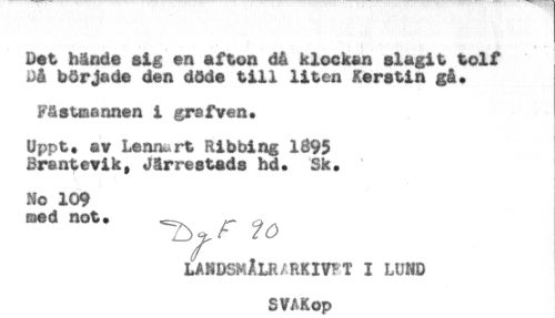 //// :. . - - * - - .. ' - - f: ' l //// Det bände sig en afton då klockan slagit tolf //// Då började den döde till liten Kerstin gå. //// Fästmannen i grafven. //// Uppt. av Lennart Ribbing 1395 //// Brantevik, Järrestads hd. Sk. //// **. ** //// No 109 //// LANDSMÅLR/RKIV^T I LUND //// SVAKoo ////