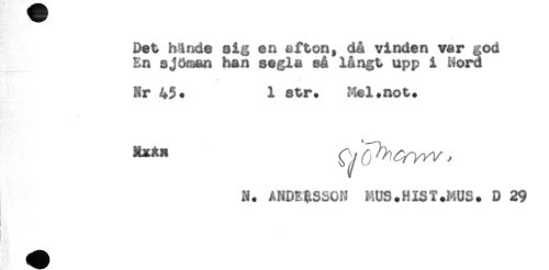 //// Det hände aig en afton, då vinden var god //// En sjöman han segla så långt upp i Hord //// Nr 43* 1 str. Mel.not. //// N. ANDERSSON MUS.HIST.MUS. D 29 //// ! ////