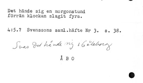 //// Det hände sig en morgonstund //// förrän klockan slagit fyra. //// 4:5.? Svenssons saml.häfte Nr 3. s. 33. //// ÅBO ////