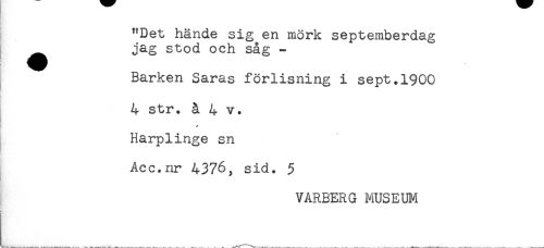 //// f //// "Det hände sig en mörk septemberdag //// jag stod och såg - //// Barken Saras förlisning i sept.1900 //// ! //// 4 str. å 4 v. //// * //// Harplinge sn //// Acc.nr 4376, sid. 5 //// VARBERG MUSEUM ////