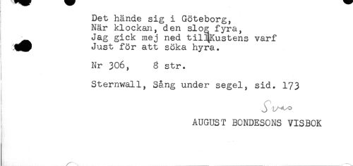 //// Det hände sig i Göteborg, //// När klockan, den slog fyra, //// ^ Jag gick mej ned til^Kustens varf //// Just för att söka hyra. //// i //// : //// Nr 306, 8 str. //// Sternwall, Sång under segel, sid. 173 //// j L"-^ //// AUGUST BONDESONS VISBOK ////