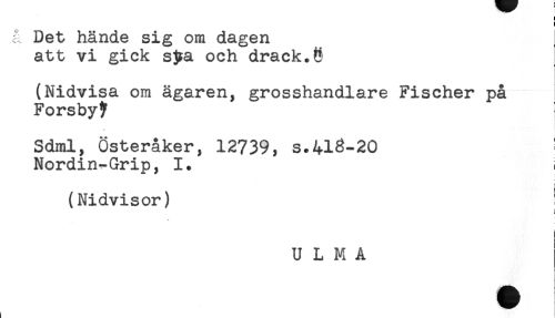 //// å Det hände sig om dagen //// att vi gick spa och drack.8 //// (Nidvisa om ägaren, grosshandlare Fischer på //// Forsby^ //// Sdml, Österåker, 12739, s.413-20 ! //// Nordin-Grip, I. i //// (Nidvisor) ! //// i //// U L M A ////