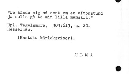 //// "De hände sig så sent om en aftonstund //// ja sulle gå te min lilla mamsäll." //// Upl. Tegelsmora, 303:613, s. 20. //// Hesselman. //// (Enstaka kärleksvisor). //// U L M A ////