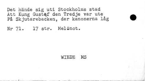 //// Det hände sig uti Stockholms stad //// Att Kung Gustqf den Tredje var ute ^ //// På Skjutarebacken, der kanonerna låg W //// Nr 71. 17 str. Melönot. //// WIEDE MS //// . //// A . ^ ^ ____-- ////