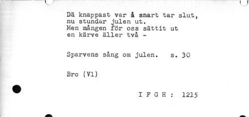 //// Dä knappast var å snart tar slut, //// nu stundar julen ut. //// Men mången för oss sättit ut //// en kärve äller två - //// Sparvens sång om julen. s. 30 //// Bro (VI) //// ^ I F G H : 1215 ////