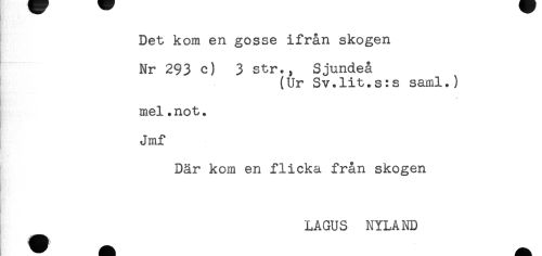 //// Det kom en gosse ifrån skogen //// Nr 293 c) 3 str., Sjundeå //// (Ur Sv.lit.s:s saml.) //// mel.not. //// Jmf //// Där kom en flicka från skogen //// LAGUS NYLAND ////