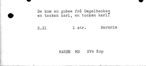 //// De kom en gubee frå Degelbacken //// ^ en töcken karl, en töcken karl? //// S.21 1 str. Barnrim //// HARBE MS SVA Kop //// i ^ . ////