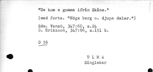 //// "De kom e gumma ifrån Skåne." [ //// (med forts. "Höga berg o. djupa dalar.") //// Sdm. Vansö, 347:60, s.24 //// G. Eriksson, 347:66, s.151 b. //// ^ U L M A //// Sånglekar //// * 1 ////