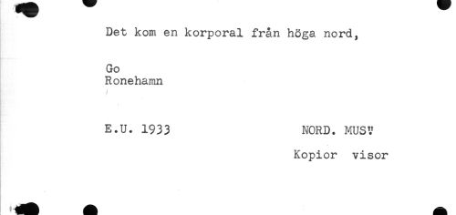 //// Det kom en korporal från höga nord, //// Go //// Ronehamn //// E.U. 1933 NORD. MUST //// Kopior visor //// * ////