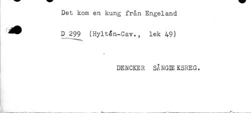 //// Det kom en kung från Engeland //// ^^ D 299 (Hyltån-Cav., lek 49) //// DENCKER SÅNGIEKSREG. //// ! ////