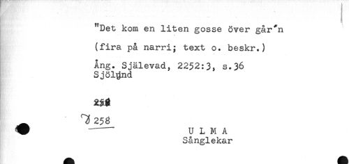 //// — s H //// ip " ... * ' * * ' - t //// "Det kom en liten gosse över går^n //// *- ... # //// (fira på narri; text o. beskr.) //// Ang. Själevad, 2252:3, s.36 //// Sjölgnd //// ^ 1 258 //// ----U L M A //// Sånglekar ////