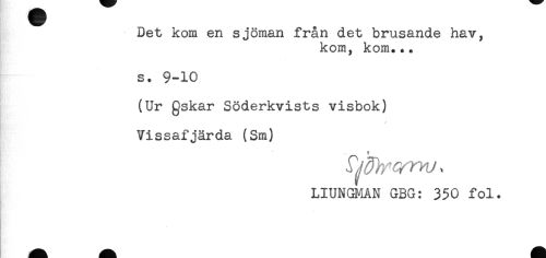 //// Det kom en sjöman från det brusande hav, //// kom, kom... //// s. 9-10 //// (Ur gskar Söderkvists visbok) //// Vissafjärda (Sm) //// LIUNGMAN GBG: 350 fol. ////