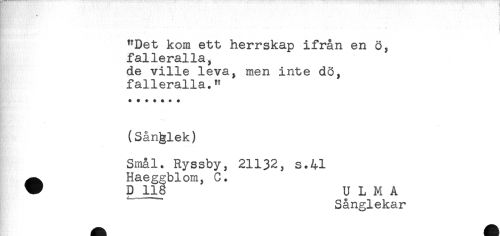 //// ' * //// "Det kom ett herrskap ifrån en ö, //// falleralla, //// de ville leva, men inte do, //// falleralla." //// (Sånglek) //// Smål. Ryssby, 21132, s.41 //// ^ Haeggblom, C. //// W P 11? U L M A //// Sånglekar ////