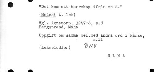 //// * "Det kom ett herrskap ifrån en ö." //// (Melodi t. lek) //// Vgl. Agnetorp, 3247:3, s.3 //// Bergstrand, Maja //// Uppgift om samma mel.med andra ord i Närke, //// s.ll //// (Lekmelodier) //// U L M A //// } ////