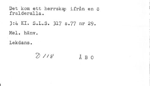 //// Det kom ett herrskap ifrån en ö ^ //// fralderalla. //// 3:4 Kl. S.L.S. 317 s.77 nr 29. //// Mel. hänv. //// t //// * //// Lekdans. //// ! //// ? A B o //// i //// i ////