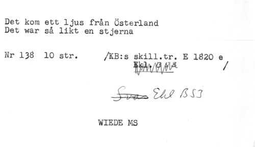//// Det kom ett ljus från Österland //// Det war så likt en stjerna //// Nr 138 10 str. /KB:s skill.tr. E 1820 e //// WIEDE MS ////