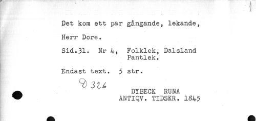 //// —J. ... - ... . - ... \ ...... . ...... ^ # — . - . . .' * //// Det kom ett par gångande, lekande, //// * //// Herr Dore. //// Sid.31. Nr 4, Folklek, Dalsland //// Pantlek. //// Endast text. $ str. //// ^ DYBECK RUNA //// ^ ANTIQV. TIDSKR. 1845 ////
