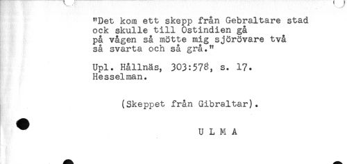 //// [ . //// "Det kom ett skepp från Gebraltare stad //// ock skulle till Ostindien gå //// på vågen så mötte mig sjörövare två //// så svarta och så grå." //// Upl. Hållnäs, 303:578, s. 17. //// Hesselman. //// (Skeppet från Gibraltar). //// ^ U L M A ////