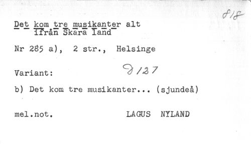//// Det kom trje mu^s i kantar alt //// iTrån Skara land //// Nr 285 a), 2 str., Helsinge //// Variant: //// /b) Det kom tre musikanter... (sjundeå) //// mel.not. LAGUS NYLAND ////