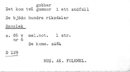 //// gubbar //// Det kom två gummor i ett snöfall //// De bjödo hundra riksdaler //// Danslek //// s* 86 v mel.not, 1 str. //// nr 6 //// Se komm. s§84 //// D 129 //// MUS. AK. FOLKMEL. //// * . ... t * //// ^ _ _ ^ n ^ ^^_____^ HH) - << **____< I .... lin .! ! «<! ////