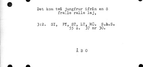 //// Det kom två jungfrur ifrån en ö //// fralle ralle lej, //// 3:2. SI, PY, ST, LT, MÖ. S.É.S. //// 55 s. 37 nr 30. //// * //// I; //// ÅBO //// ( ////