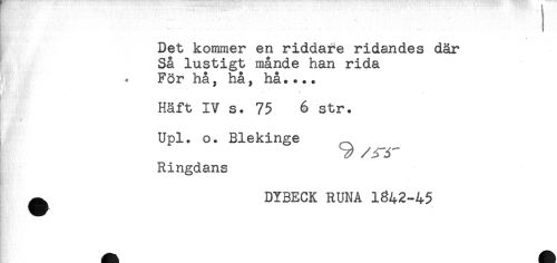 //// Det kommer en riddare ridandes där //// Så lustigt månde han rida //// [ « För hå, hå, hå.* +. //// * //// t //// Häft IV s. 75 6 str. //// Upl. o. Blekinge //// 9 /jrr //// Ringdans //// ^ DYBECK RUNA 1842-45 ////