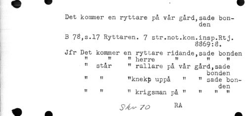 //// Det kommer en ryttare på vår gård,sade bon- //// den //// B 78,s.l7 Ryttaren. 7 str.not.kom.insp.Rtj. //// 8869:8. //// Jfr Det kommer en ryttare ridande,sade bonden //// " " " herre " " " //// " står " rallare på vår gård,sade //// bonden //// " ^ "knek^ uppå " " sade bon- //// den //// " ^ " krigsman på " " " " //// - F H § n ^ ////