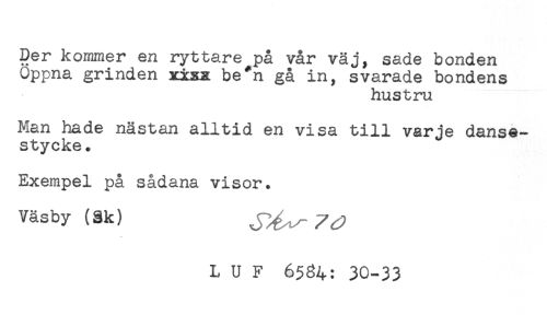 //// Der kommer en ryttare på vår väj, sade bonden //// Öppna grinden xixx be*n gå in, svarade bondens //// hustru //// Man hade nästan alltid en visa till varje danse- //// stycke. //// Exempel på sådana visor. //// Väsby (3k) J^^ //// L U F 6584: 30-33 ////